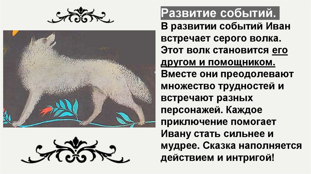 ● Волк помогает Ивану: переносит его, даёт советы, помогает пройти испытания.