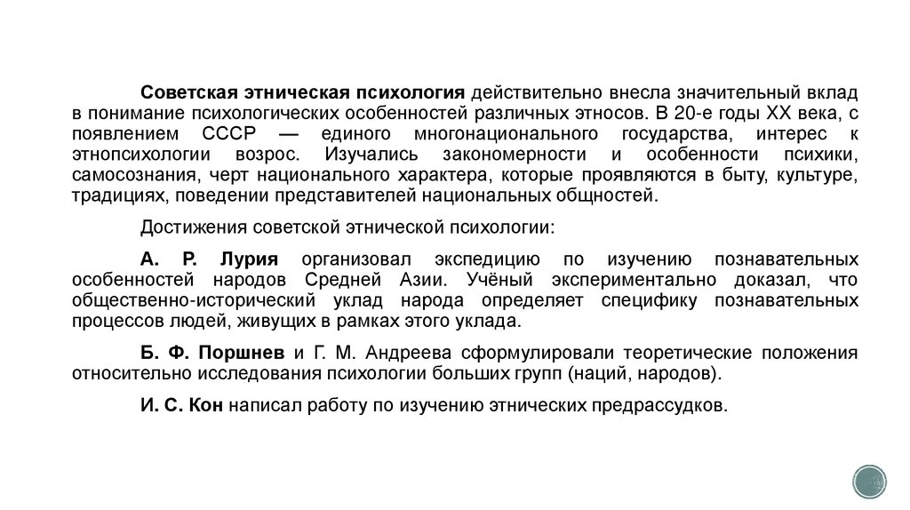 Советская этническая психология действительно внесла значительный вкладв понимание психологических особенностей различных этносов. В 20-е годы XX века, с