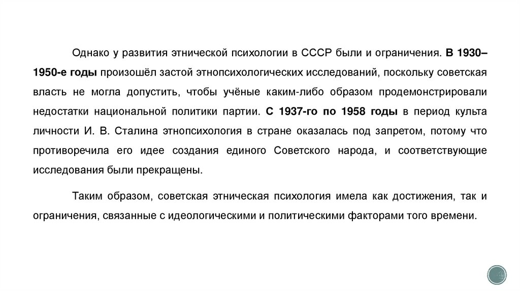 Однако у развития этнической психологии в СССР были и ограничения. В 1930–1950-е годы произошёл застой этнопсихологических исследований, поскольку советская
