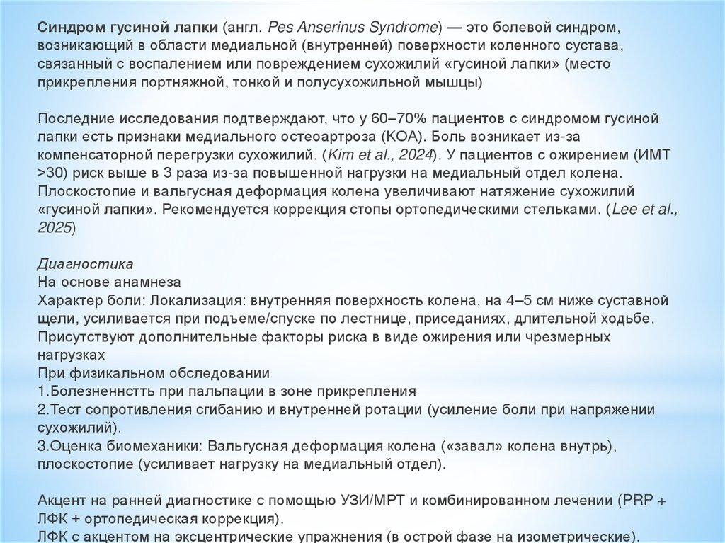 Синдром гусиной лапки (англ. Pes Anserinus Syndrome) — это болевой синдром,возникающий в области медиальной (внутренней) поверхности коленного сустава,