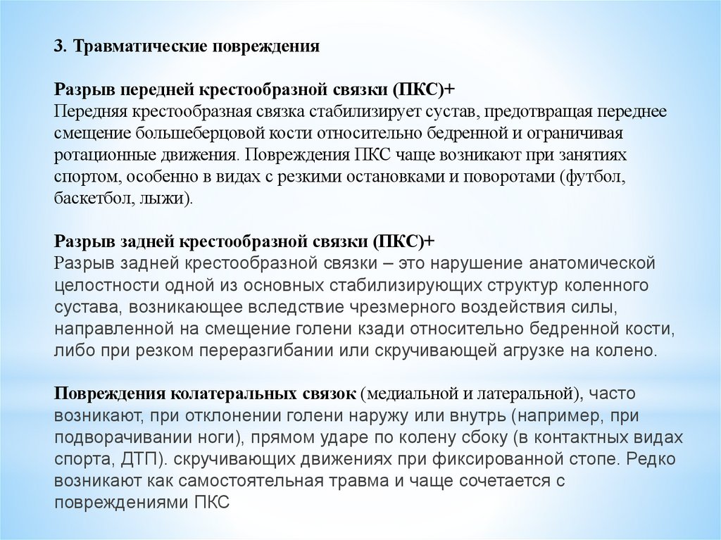 3. Травматические поврежденияРазрыв передней крестообразной связки (ПКС)+
