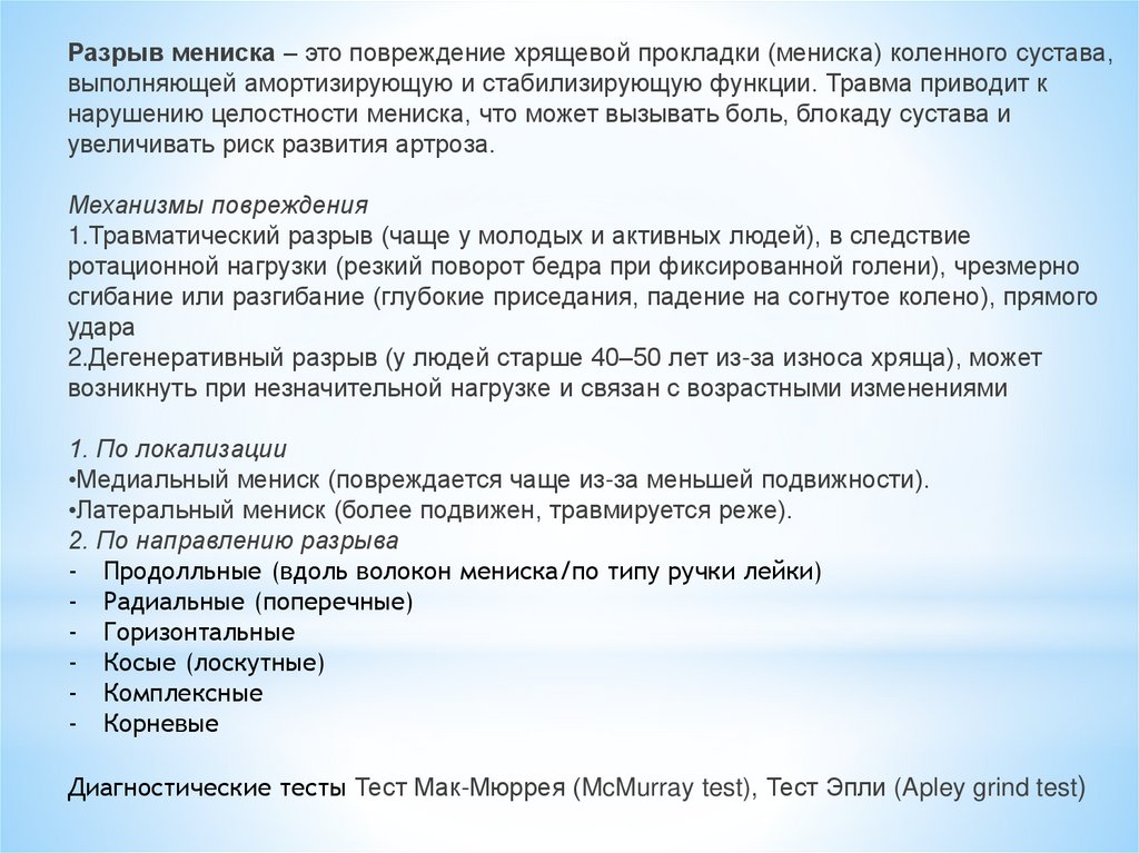 нарушению целостности мениска, что может вызывать боль, блокаду сустава и