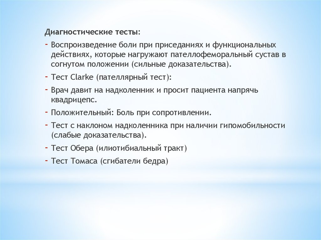 Диагностические тесты:- Воспроизведение боли при приседаниях и функциональных