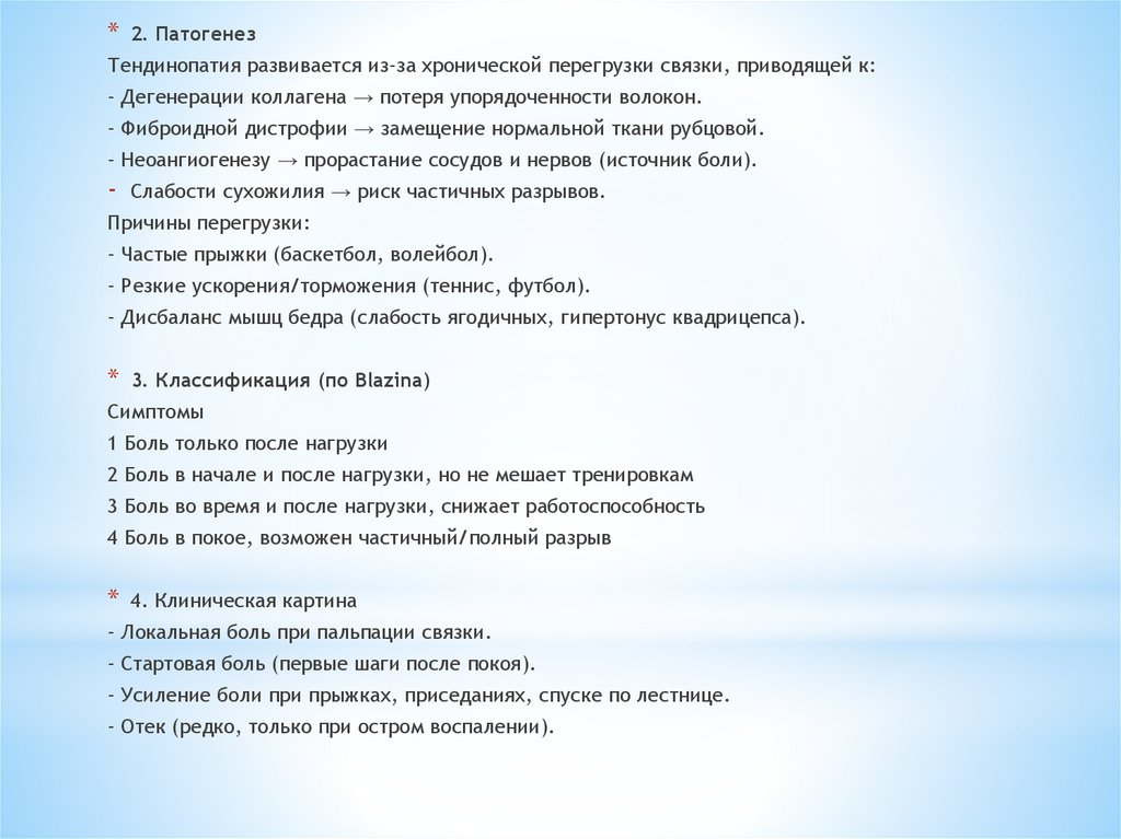 * 2. ПатогенезТендинопатия развивается из-за хронической перегрузки связки, приводящей к: