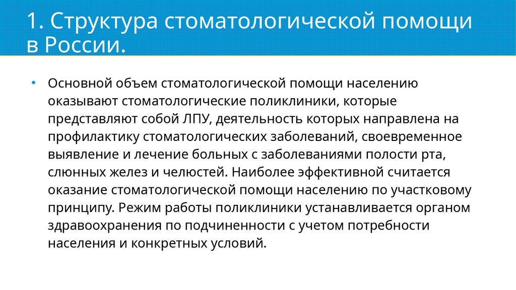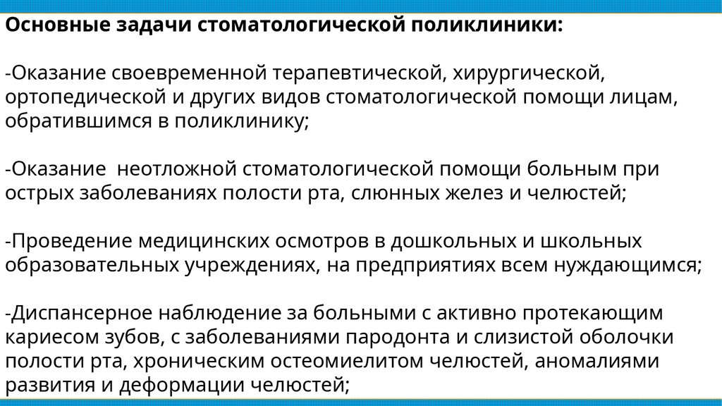 Основные задачи стоматологической поликлиники:-Оказание своевременной терапевтической, хирургической,