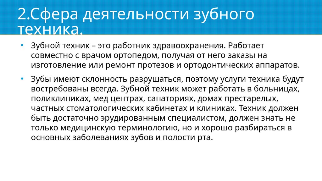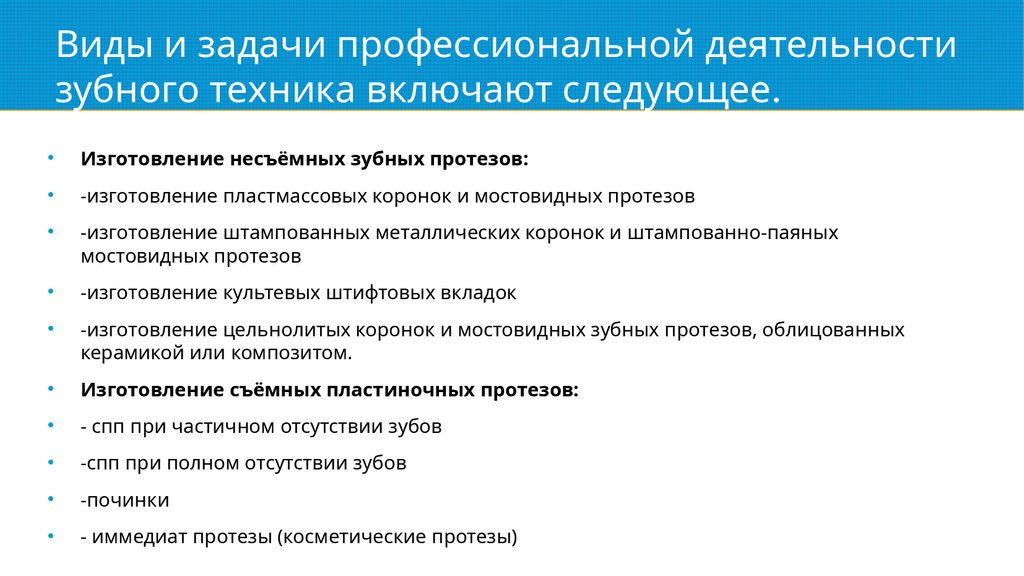 Виды и задачи профессиональной деятельностизубного техника включают следующее.