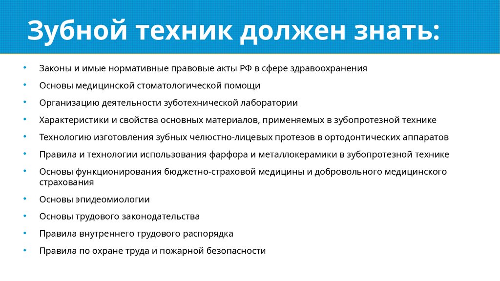 Зубной техник должен знать:Законы и имые нормативные правовые акты РФ в сфере здравоохранения