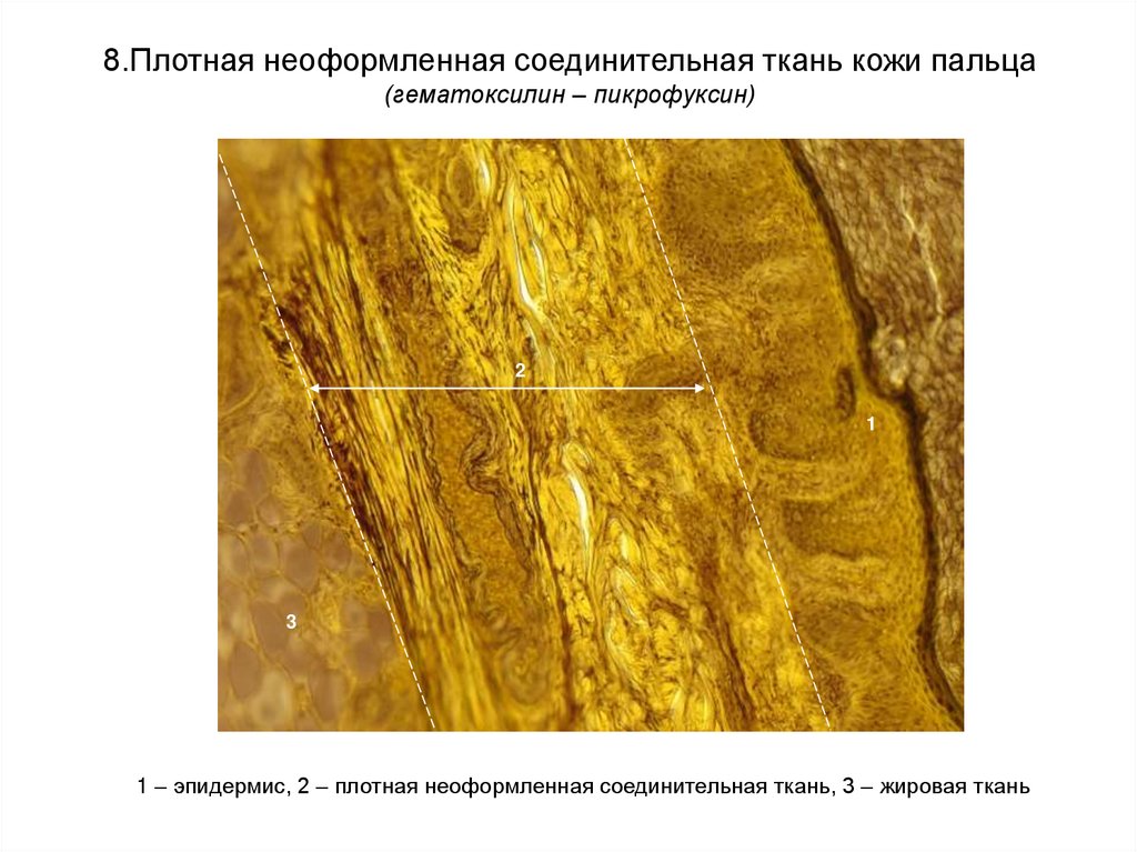 8.Плотная неоформленная соединительная ткань кожи пальца(гематоксилин – пикрофуксин)