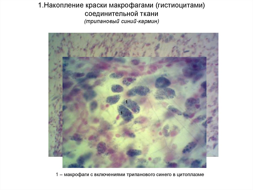 1.Накопление краски макрофагами (гистиоцитами)соединительной ткани