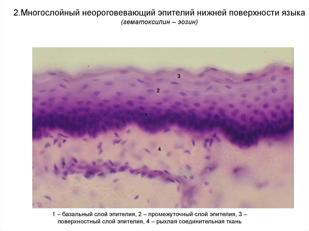 2.Многослойный неороговевающий эпителий нижней поверхности языка(гематоксилин – эозин)