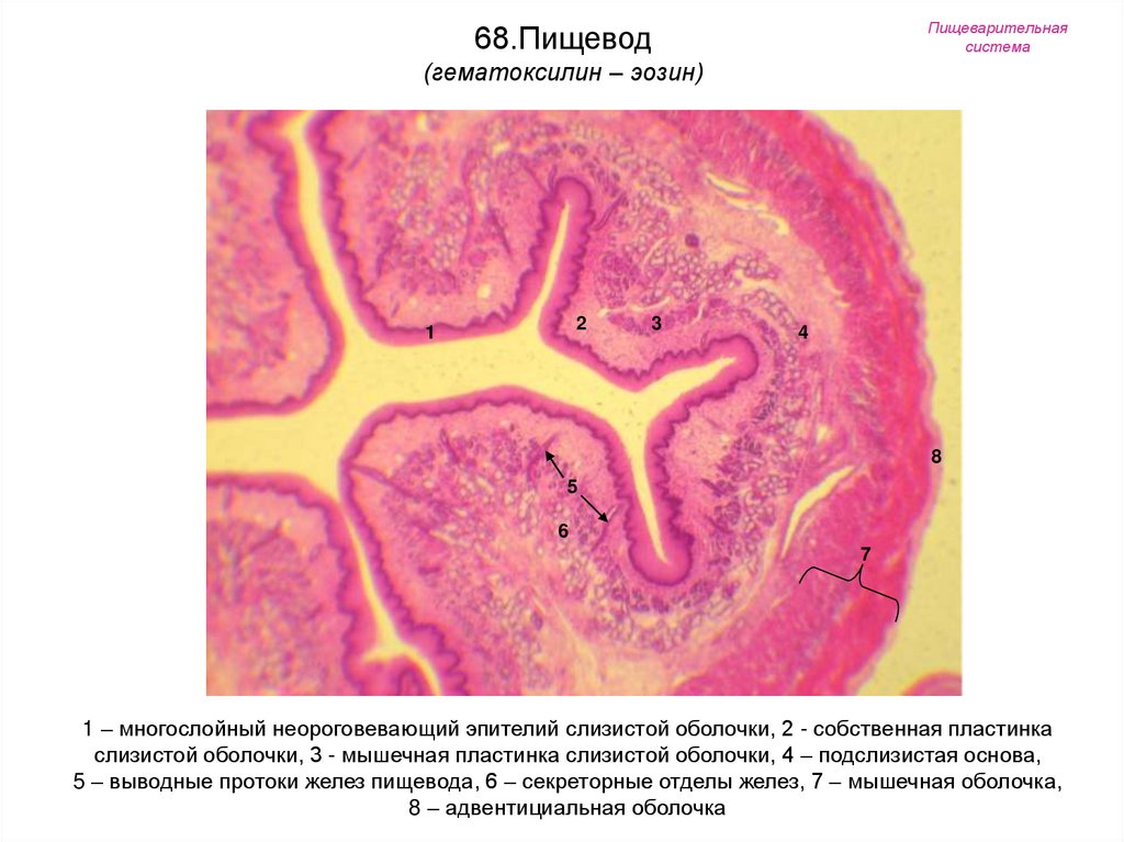 – мышечная пластинка слизистой, 5 - подслизистая основа, 6 – фиброзно-хрящевая оболочка, 7