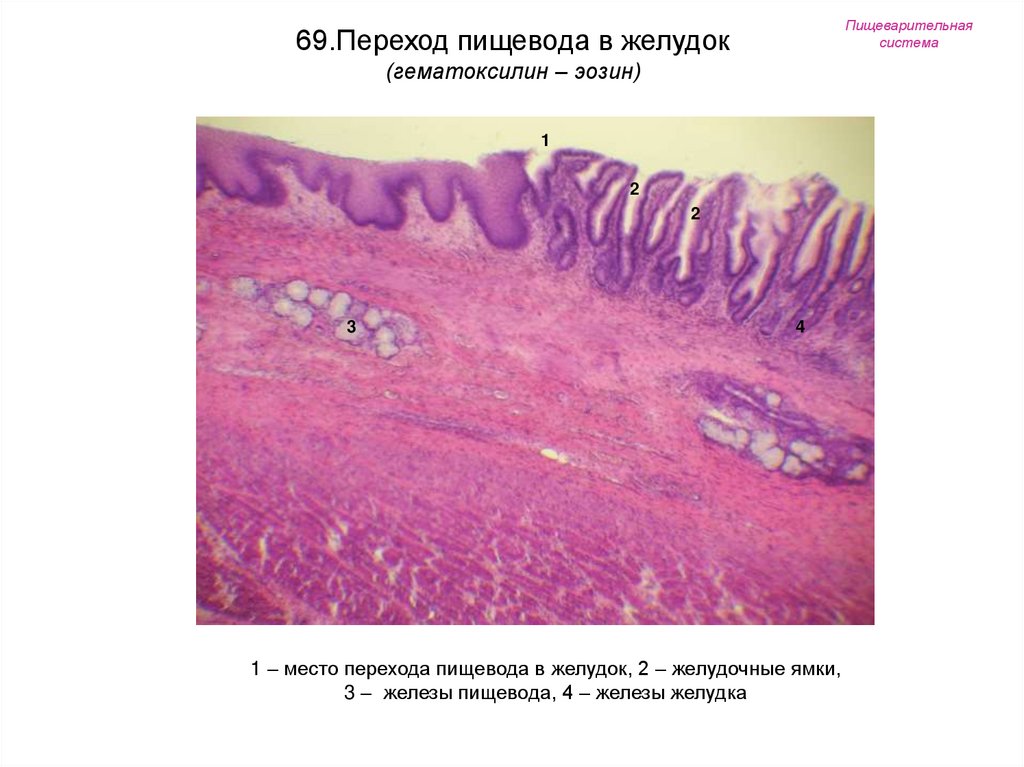 1 – место перехода пищевода в желудок, 2 – желудочные ямки,