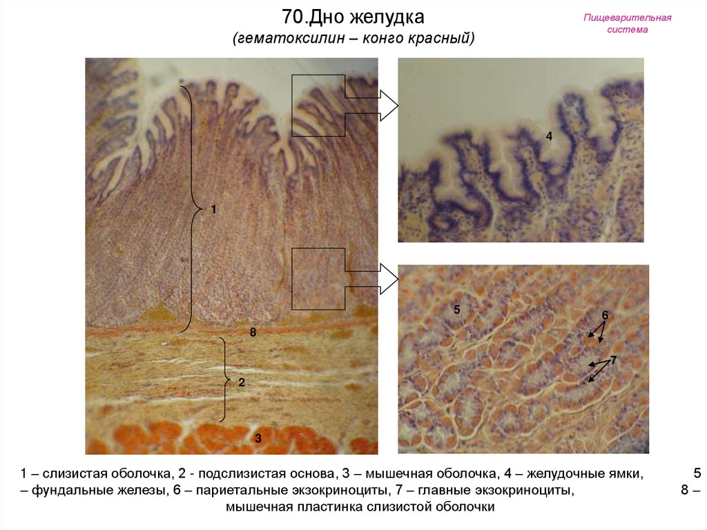 1 – слизистая оболочка, 2 - подслизистая основа, 3 – мышечная оболочка, 4 – желудочные ямки,