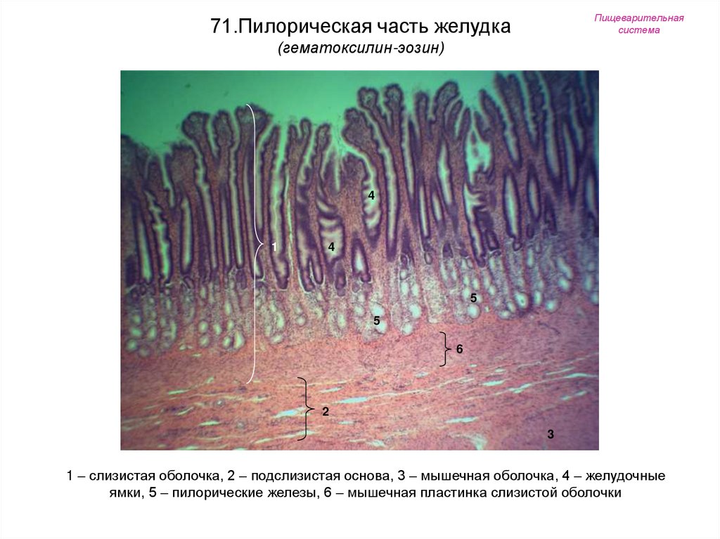 ямки, 5 – пилорические железы, 6 – мышечная пластинка слизистой оболочки