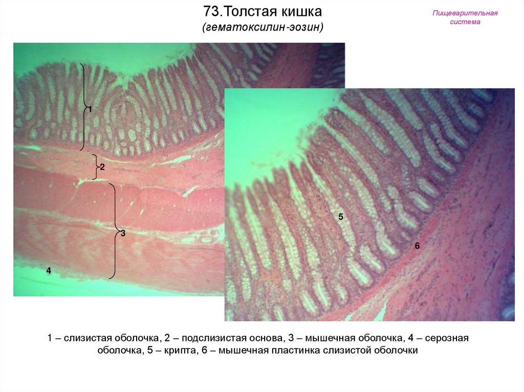 оболочка, 5 – крипта, 6 – мышечная пластинка слизистой оболочки