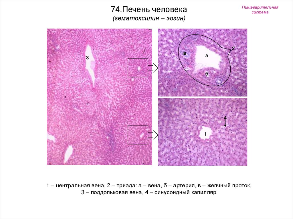 1 – центральная вена, 2 – триада: а – вена, б – артерия, в – желчный проток,