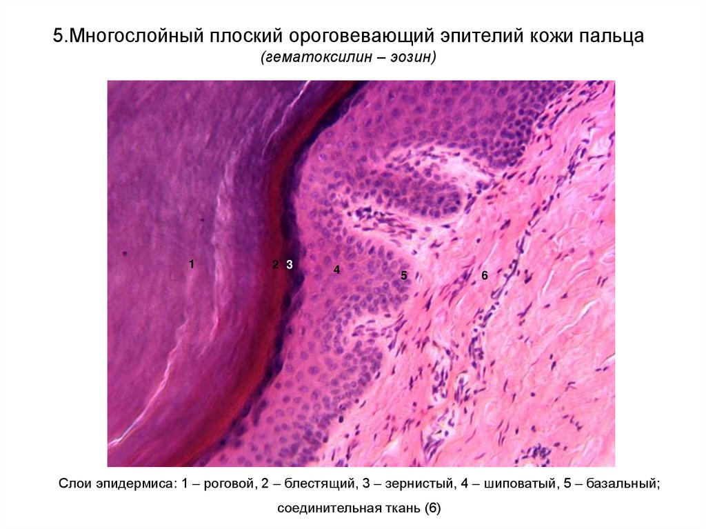 Слои эпидермиса: 1 – роговой, 2 – блестящий, 3 – зернистый, 4 – шиповатый, 5 – базальный;