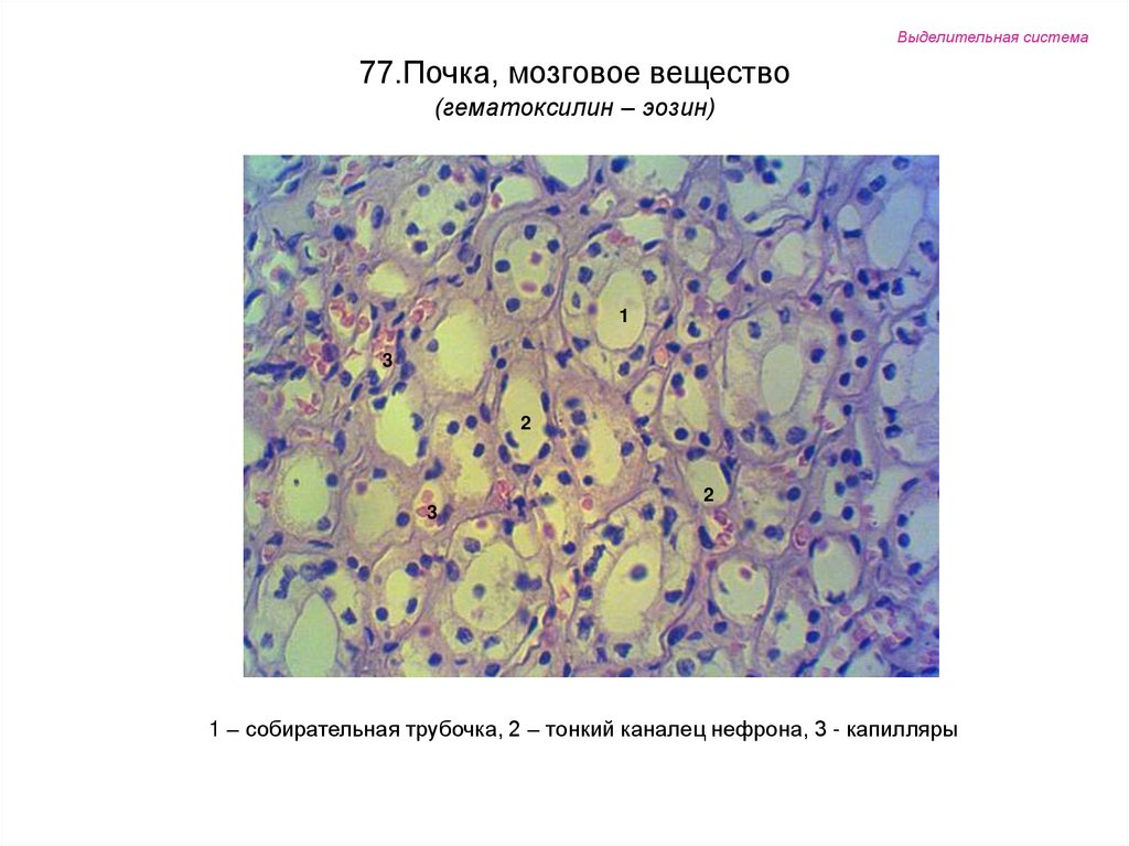1 – собирательная трубочка, 2 – тонкий каналец нефрона, 3 - капилляры