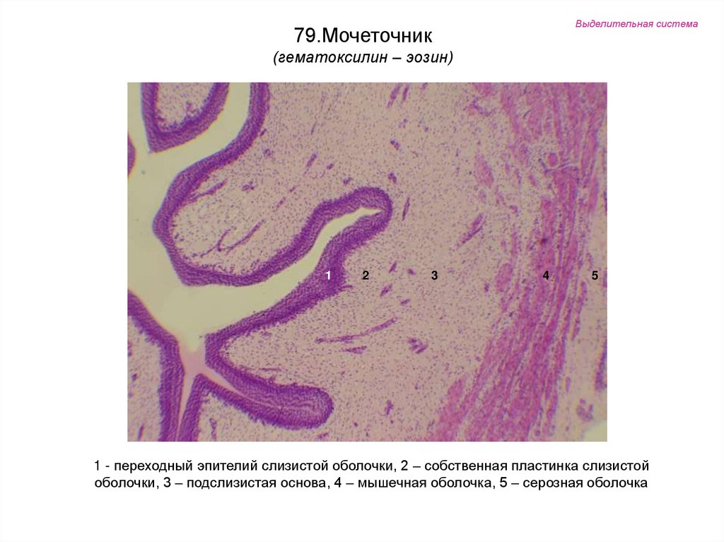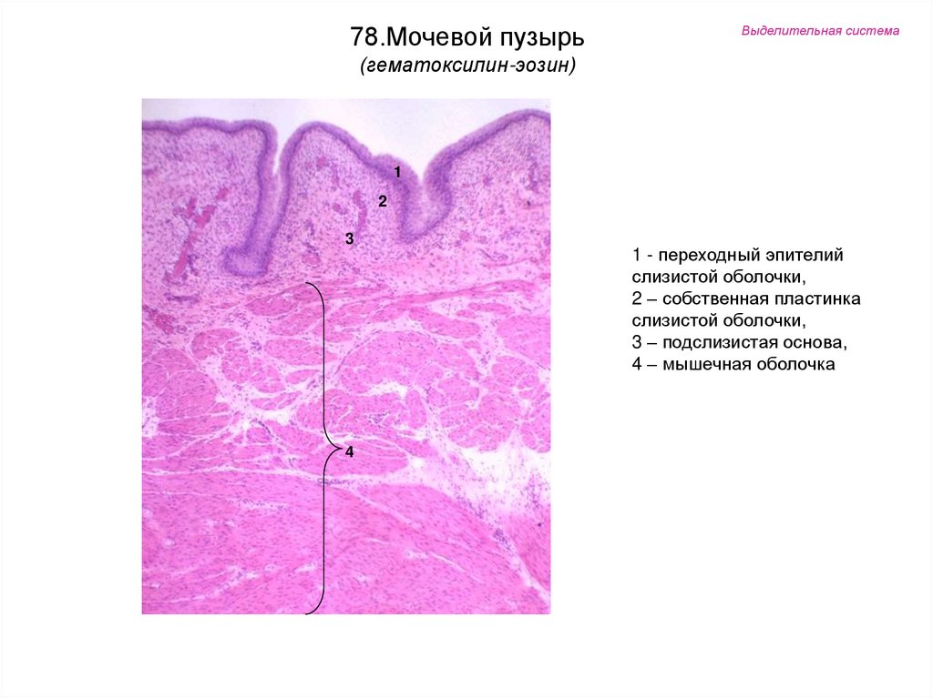 1 - переходный эпителий слизистой оболочки, 2 – собственная пластинка слизистой