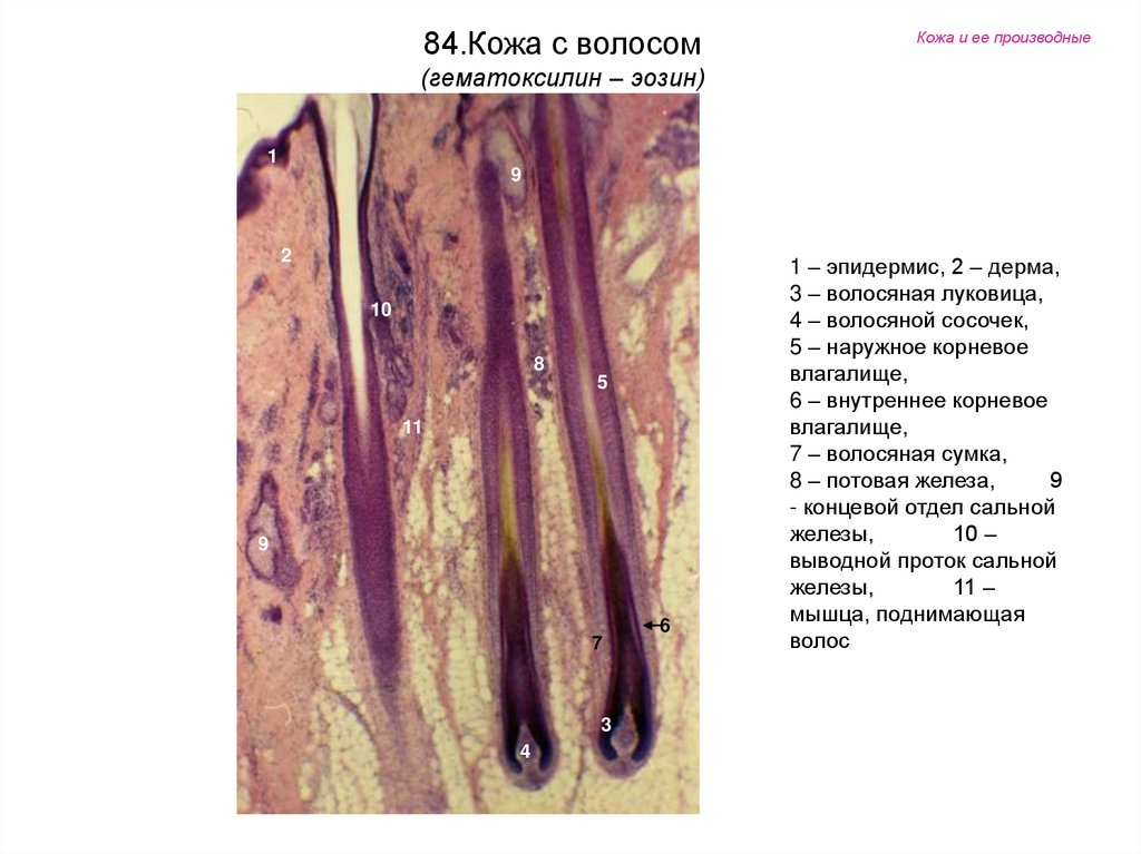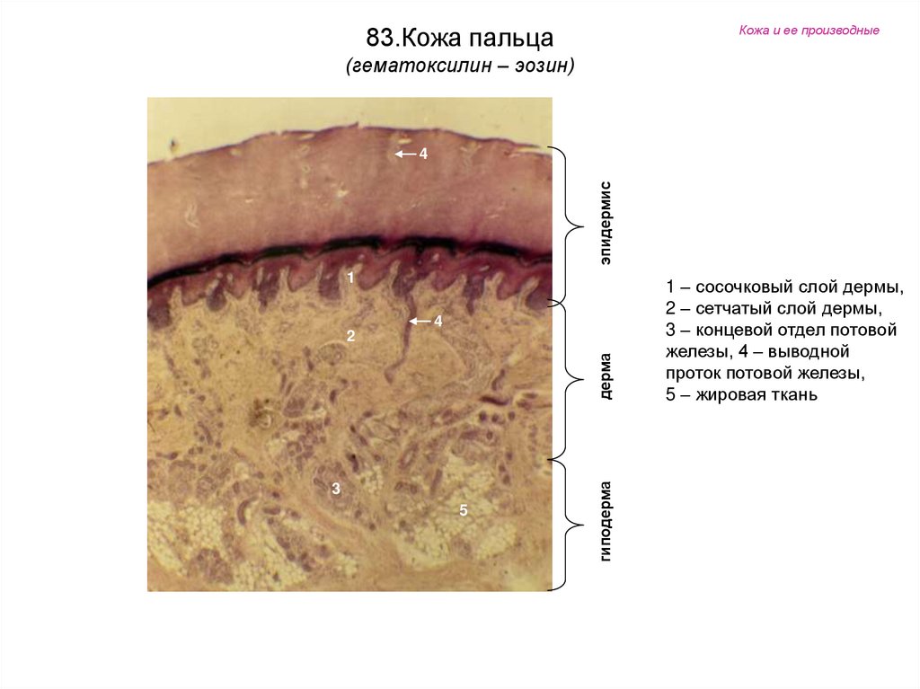 1 – эпидермис, 2 – плотная неоформленная соединительная ткань, 3 – жировая ткань