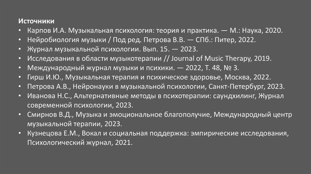 Источники• Карпов И.А. Музыкальная психология: теория и практика. — М.: Наука, 2020.