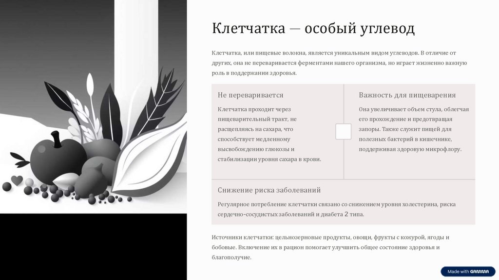Клетчатка — особый углеводКлетчатка, или пищевые волокна, является уникальным видом углеводов. В отличие от