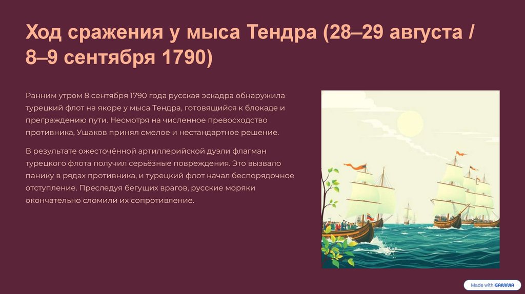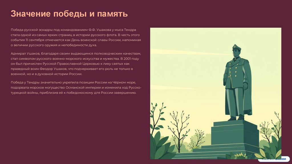 Значение победы и памятьПобеда русской эскадры под командованием Ф.Ф. Ушакова у мыса Тендра