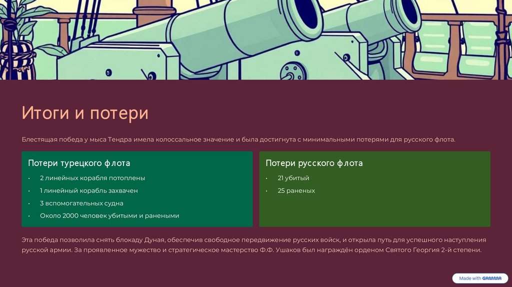 Итоги и потериБлестящая победа у мыса Тендра имела колоссальное значение и была достигнута с минимальными потерями для русского флота.