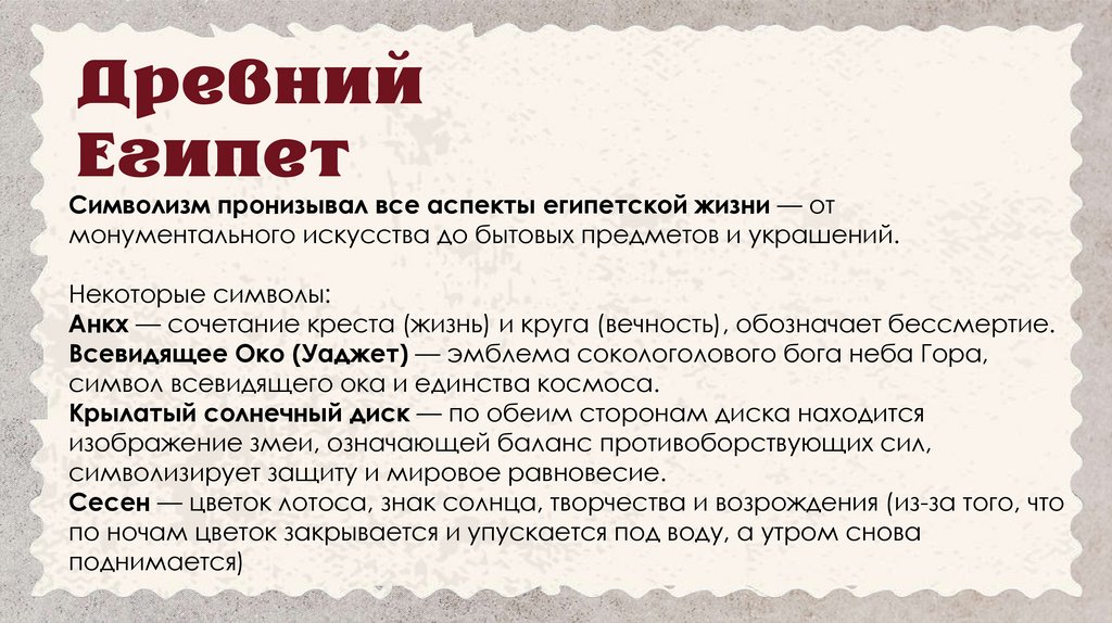Анкх — сочетание креста (жизнь) и круга (вечность), обозначает бессмертие.