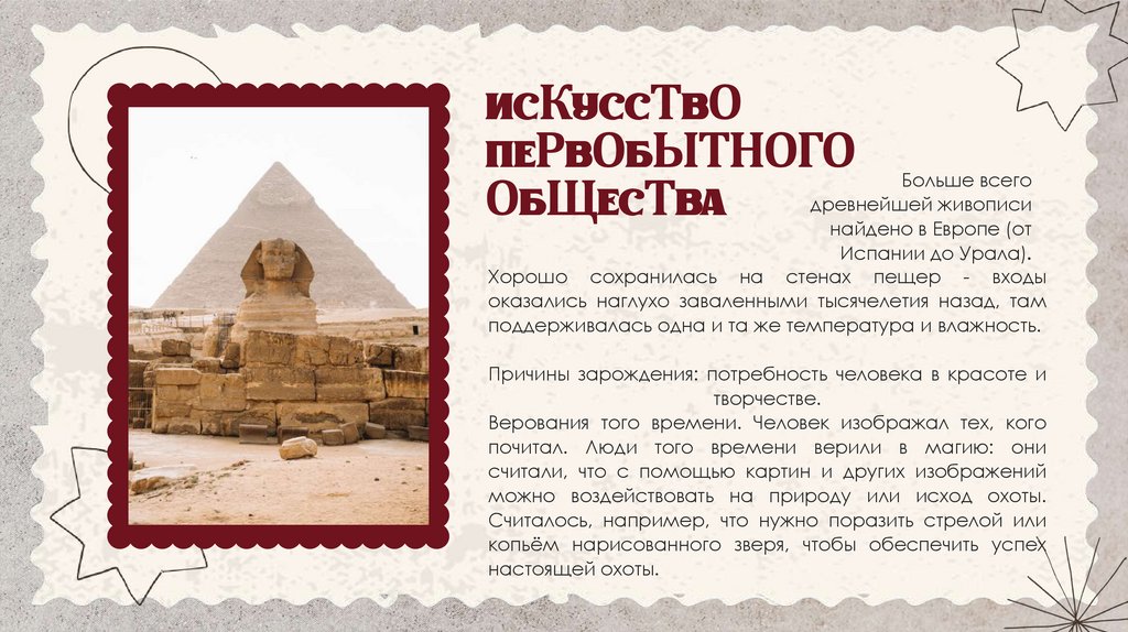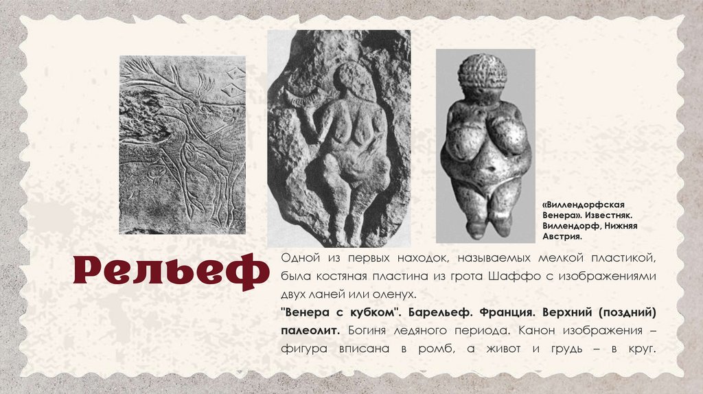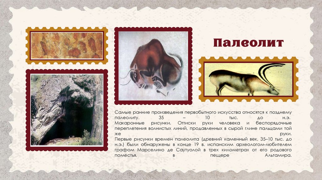 ПалеолитСамые ранние произведения первобытного искусства относятся к позднему