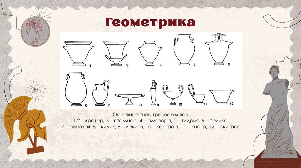 7 – ойнохоя. 8 – килик, 9 – лекиф, 10 – канфар, 11 – киаф, 12 – скифос