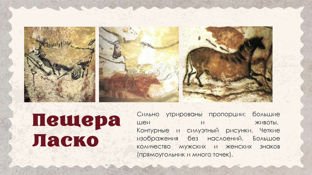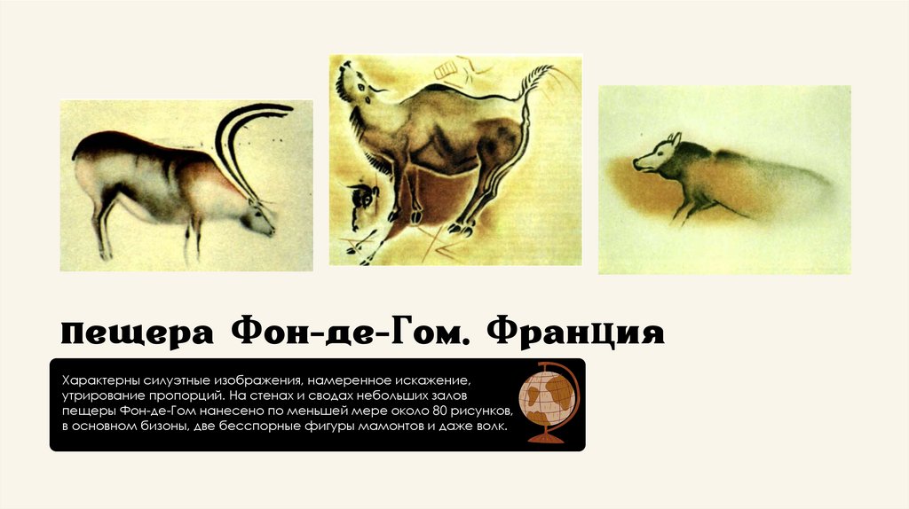 Пещера Фон-де-Гом. ФранцияХарактерны силуэтные изображения, намеренное искажение,