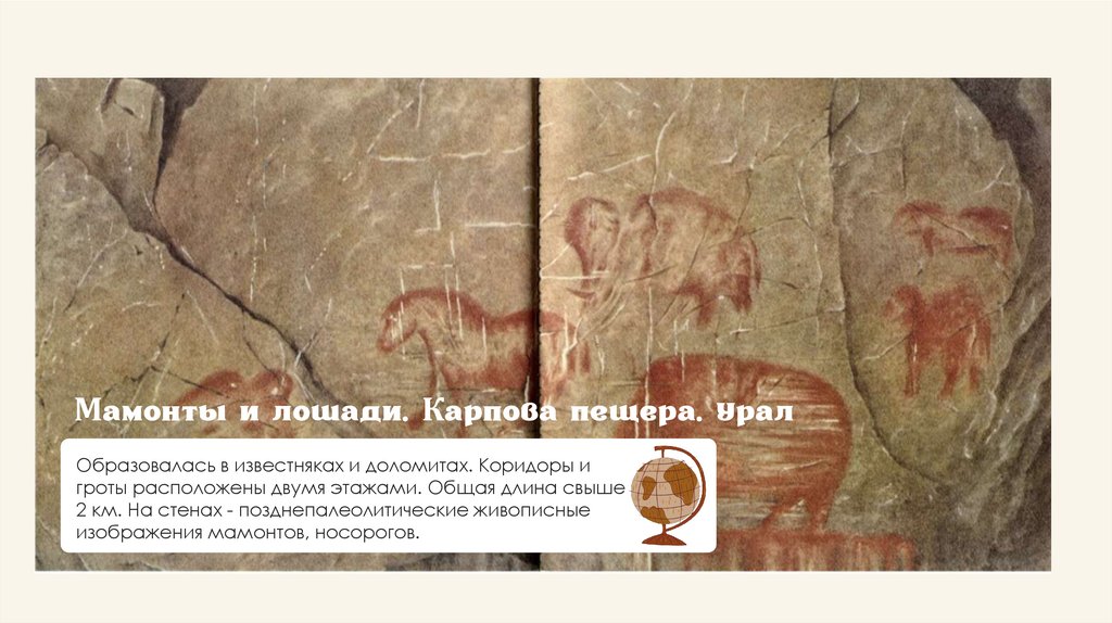 Мамонты и лошади. Карпова пещера. УралОбразовалась в известняках и доломитах. Коридоры и