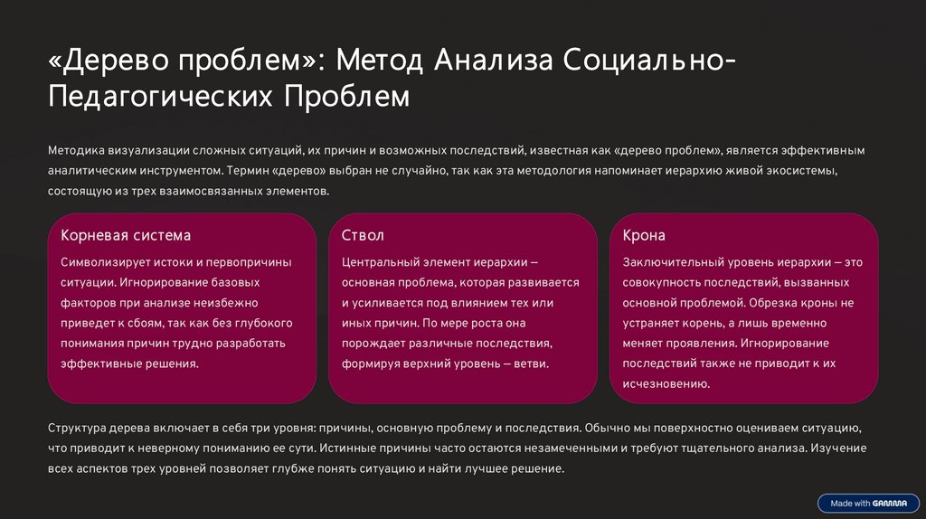 «Дерево проблем»: Метод Анал иза Социал ь ноПедагогических ПроблемМетодика визуализации сложных ситуаций, их причин и возможных последствий, известная как «дерево проблем», является эффективным