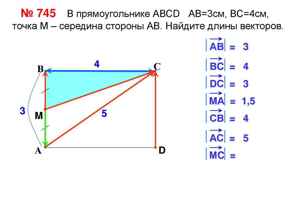 № 745 В прямоугольнике АВСD АВ=3см, ВС=4см,точка М – середина стороны АВ. Найдите длины векторов.