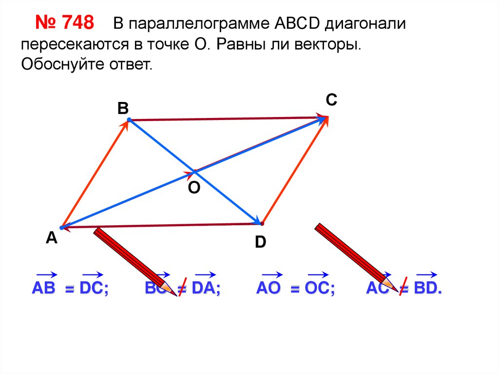 № 748 В параллелограмме АВСD диагоналипересекаются в точке О. Равны ли векторы.