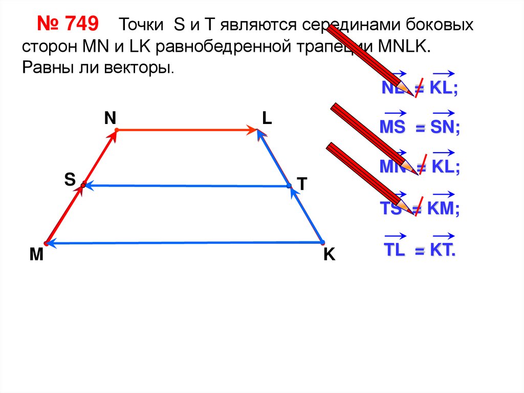 № 749 Точки S и Т являются серединами боковыхсторон MN и LK равнобедренной трапеции MNLK.