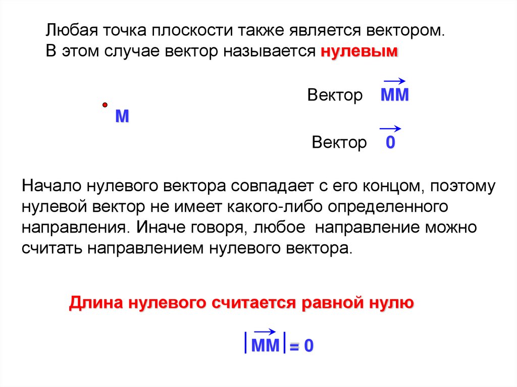 Любая точка плоскости также является вектором.В этом случае вектор называется нулевым