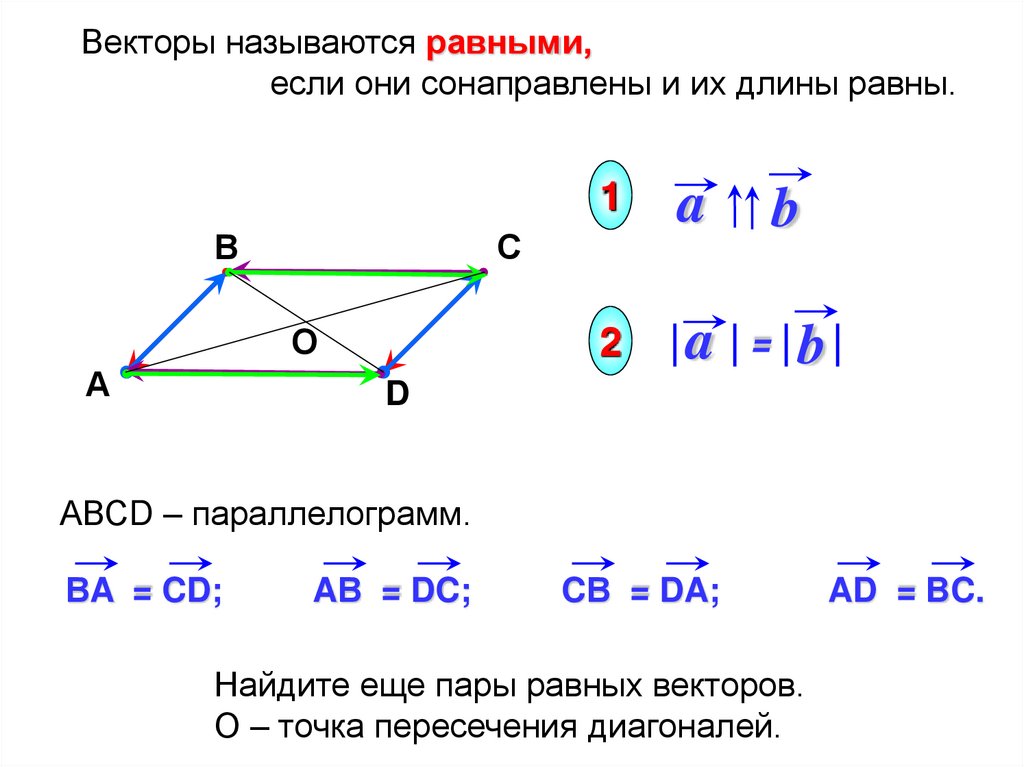 Векторы называются равными,если они сонаправлены и их длины равны.