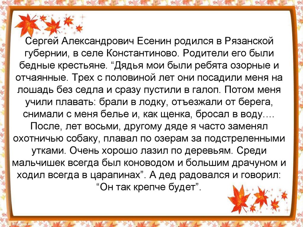 Сергей Александрович Есенин родился в Рязанскойгубернии, в селе Константиново. Родители его были