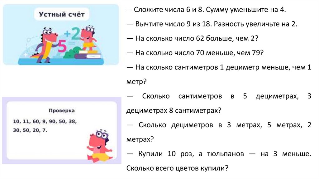 — Сложите числа 6 и 8. Сумму уменьшите на 4.— Вычтите число 9 из 18. Разность увеличьте на 2.