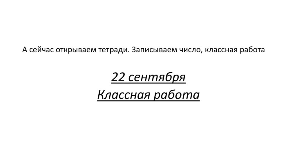А сейчас открываем тетради. Записываем число, классная работа22 сентября