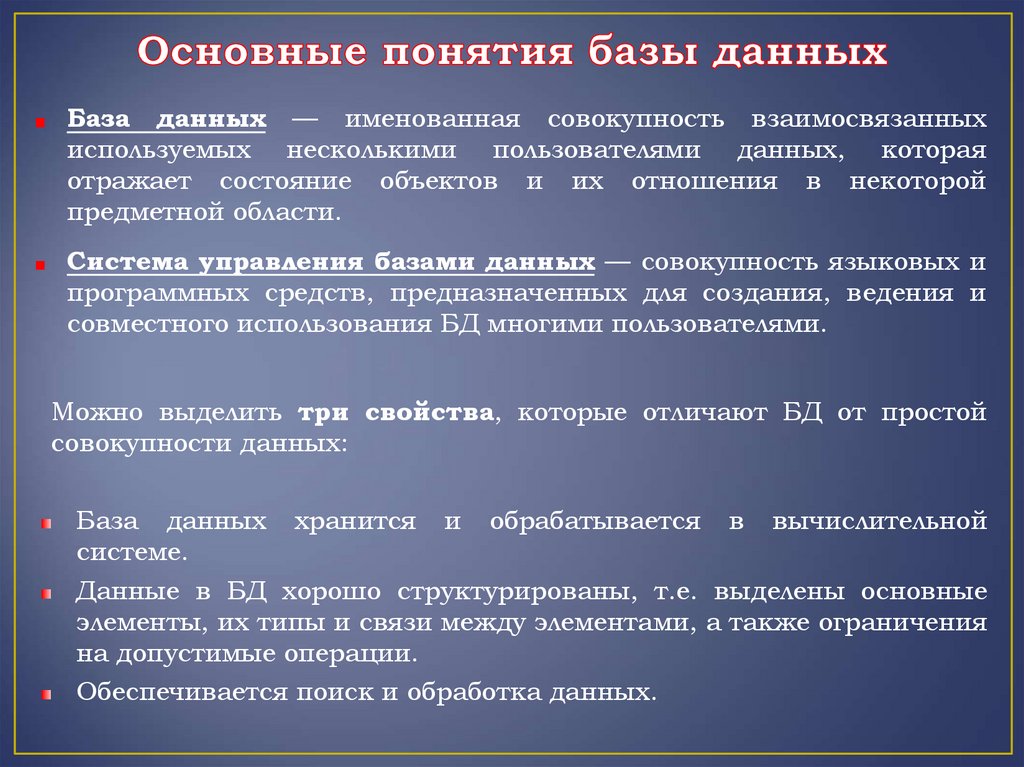 Можно выделить три свойства, которые отличают БД от простой