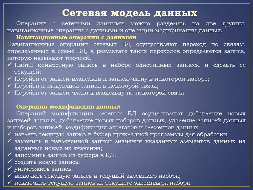 В теории БД модель данных описывает информационные объектыпредметной области, взаимосвязи между ними и позволяет: