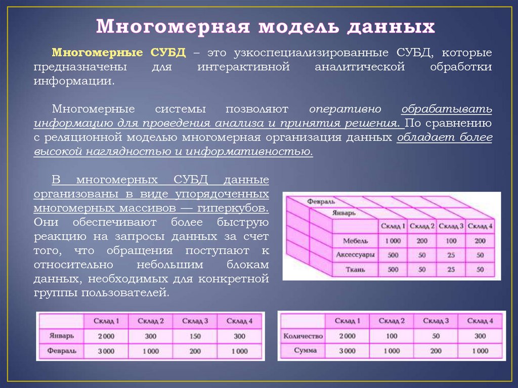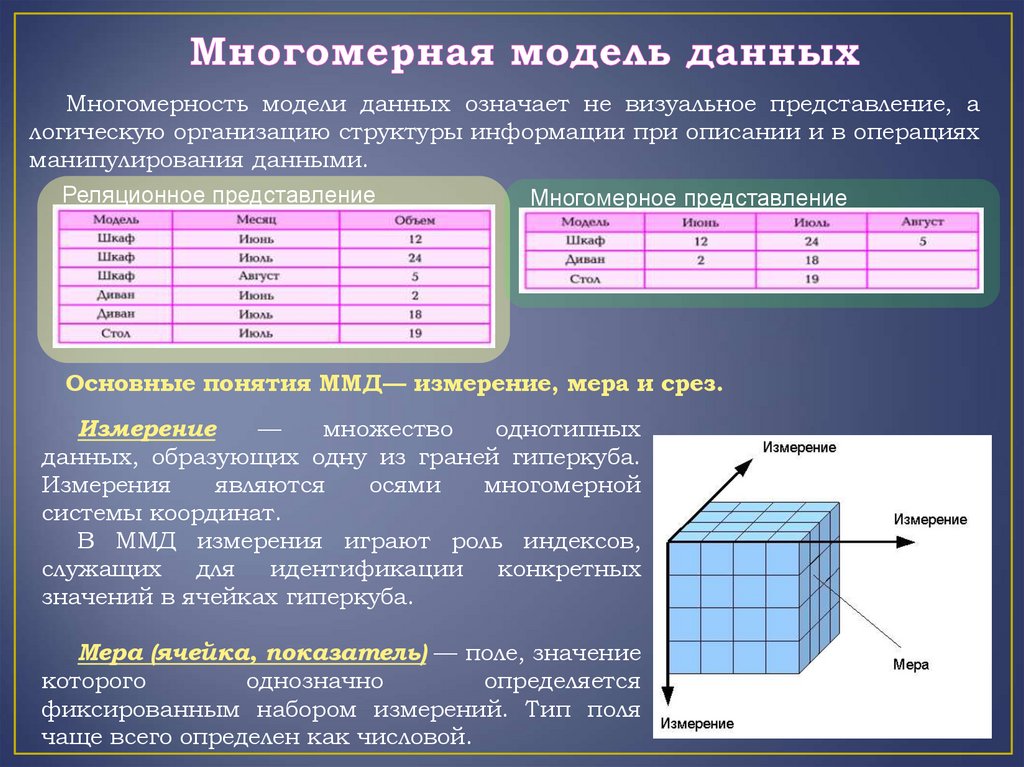 Многомерность модели данных означает не визуальное представление, алогическую организацию структуры информации при описании и в операциях