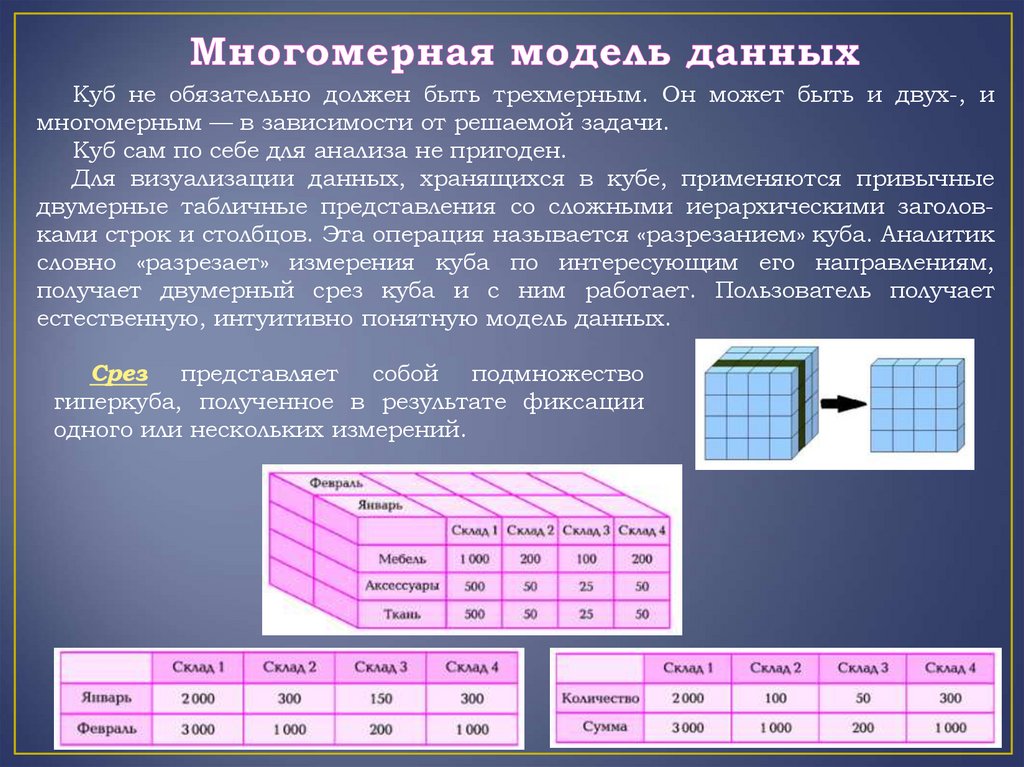 двумерные табличные представления со сложными иерархическими заголовками строк и столбцов. Эта операция называется «разрезанием» куба. Аналитик