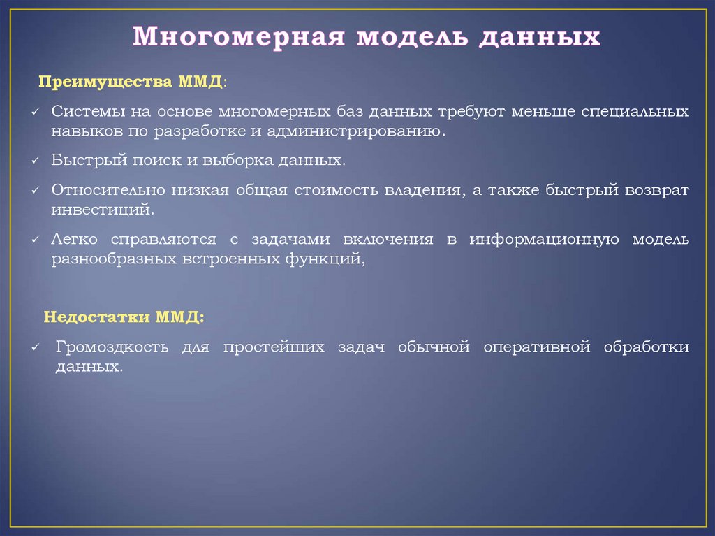 Преимущества ММД:Системы на основе многомерных баз данных требуют меньше специальных