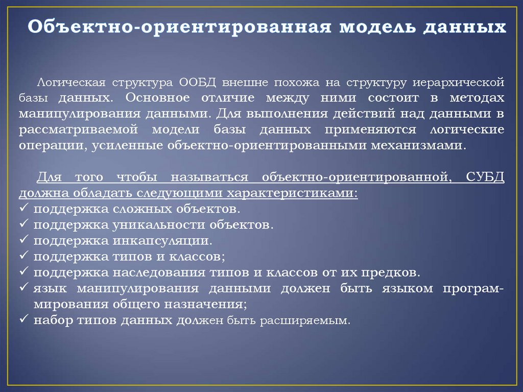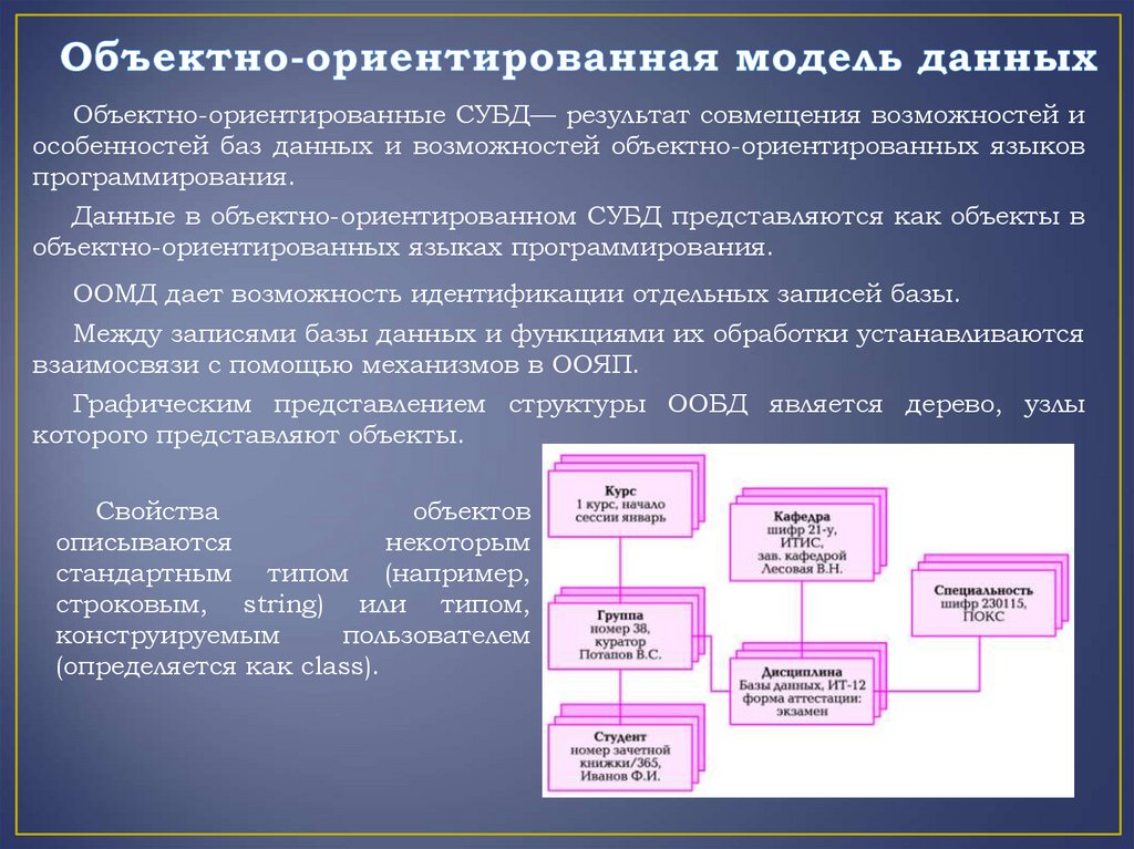 Объектно-ориентированные СУБД— результат совмещения возможностей иособенностей баз данных и возможностей объектно-ориентированных языков