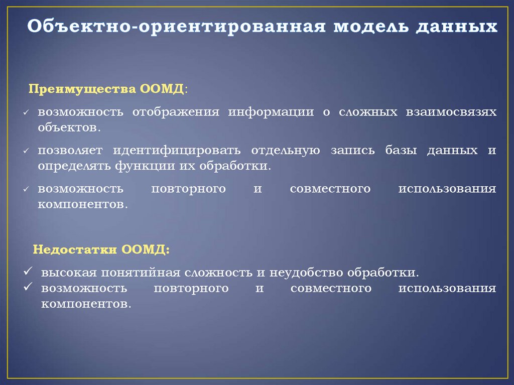 Преимущества ООМД:возможность отображения информации о сложных взаимосвязях