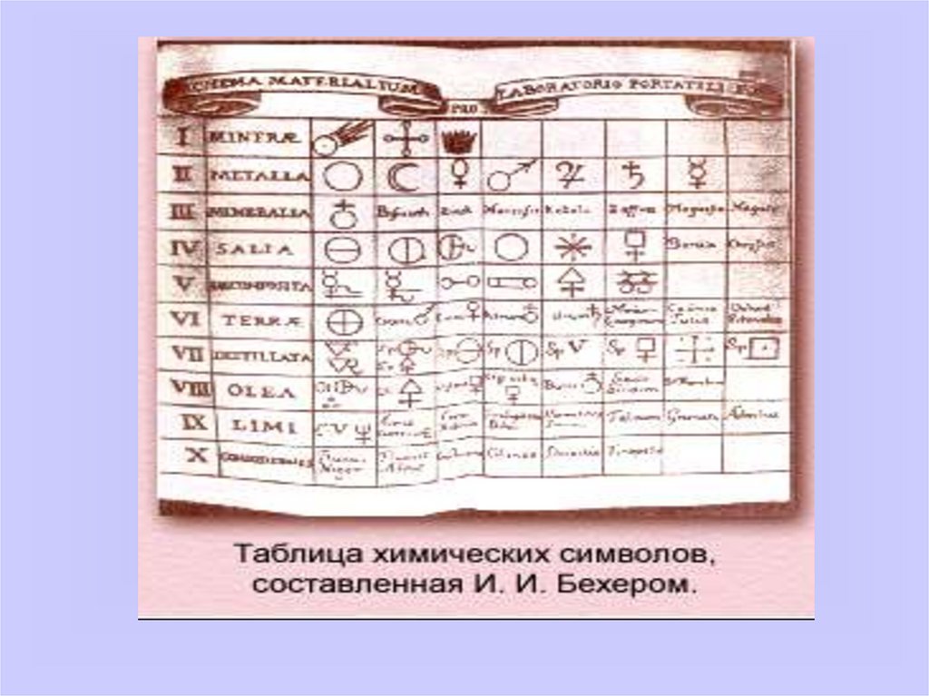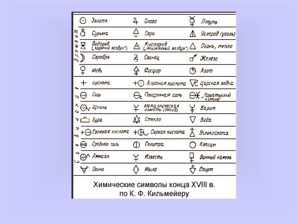 пользовался своей собственной системой обозначений веществ.9. В XVIII веке укоренилась система обозначений элементов (которых в то время стало известно уже три десятка) в виде